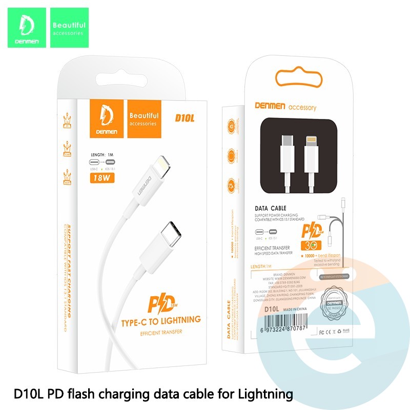 Кабель Denmen D10L Type-C на Lightning 20W 1м белый